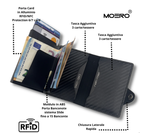 Tutti i prodotti MOERO sono realizzati con materiali di alta qualità e lavorati a mano da artigiani esperti. Inoltre i portacarte in dotazione vantano la RFID (Radio Frequency Identification Protection) ovvero involucri rigidi schermati che impediscono la comunicazione delle carte al loro interno con dispositivi di pagamento portatili per evitare eventuali frodi. I portafogli possono contenere 7 carte nello scompartimento RFID con meccanismo di espulsione automatica unito a un blocco di sicurezza anticaduta infallibile*; 6 carte negli scompartimenti interni insieme a eventuali monete, banconote e biglietti da visita. I modelli zip hanno una cerniera esterna che permette di conservare monete in una tasca separata.