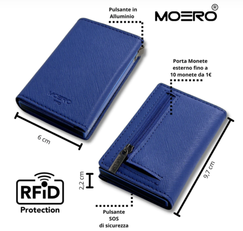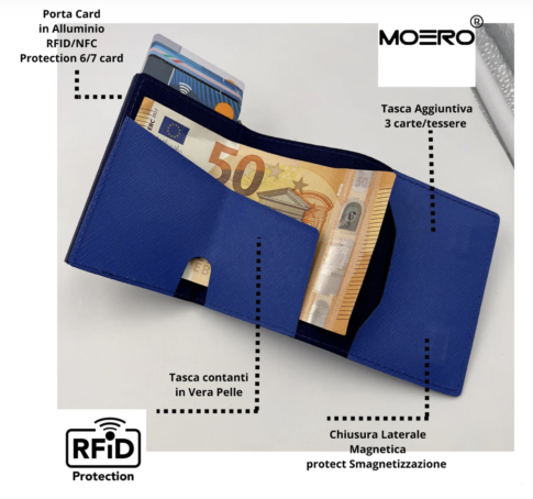 Tutti i prodotti MOERO sono realizzati con materiali di alta qualità e lavorati a mano da artigiani esperti. Inoltre i portacarte in dotazione vantano la RFID (Radio Frequency Identification Protection) ovvero involucri rigidi schermati che impediscono la comunicazione delle carte al loro interno con dispositivi di pagamento portatili per evitare eventuali frodi. I portafogli possono contenere 7 carte nello scompartimento RFID con meccanismo di espulsione automatica unito a un blocco di sicurezza anticaduta infallibile*; 6 carte negli scompartimenti interni insieme a eventuali monete, banconote e biglietti da visita. I modelli zip hanno una cerniera esterna che permette di conservare monete in una tasca separata.