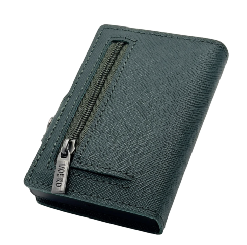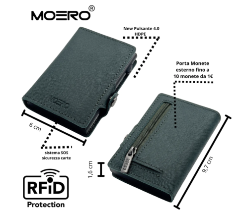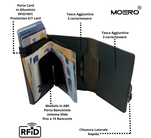 Tutti i prodotti MOERO sono realizzati con materiali di alta qualità e lavorati a mano da artigiani esperti. Inoltre i portacarte in dotazione vantano la RFID (Radio Frequency Identification Protection) ovvero involucri rigidi schermati che impediscono la comunicazione delle carte al loro interno con dispositivi di pagamento portatili per evitare eventuali frodi. I portafogli possono contenere 7 carte nello scompartimento RFID con meccanismo di espulsione automatica unito a un blocco di sicurezza anticaduta infallibile*; 6 carte negli scompartimenti interni insieme a eventuali monete, banconote e biglietti da visita. I modelli zip hanno una cerniera esterna che permette di conservare monete in una tasca separata.