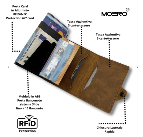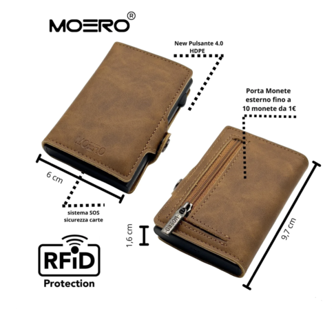 Tutti i prodotti MOERO sono realizzati con materiali di alta qualità e lavorati a mano da artigiani esperti. Inoltre i portacarte in dotazione vantano la RFID (Radio Frequency Identification Protection) ovvero involucri rigidi schermati che impediscono la comunicazione delle carte al loro interno con dispositivi di pagamento portatili per evitare eventuali frodi. I portafogli possono contenere 7 carte nello scompartimento RFID con meccanismo di espulsione automatica unito a un blocco di sicurezza anticaduta infallibile*; 6 carte negli scompartimenti interni insieme a eventuali monete, banconote e biglietti da visita. I modelli zip hanno una cerniera esterna che permette di conservare monete in una tasca separata.